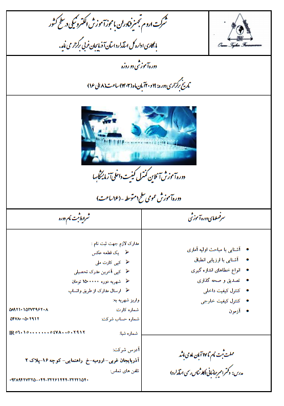 دوره آموزش آنلاین کنترل کیفیت داخلی آزمایشگاهها دوره آموزش عمومی سطح 1 متوسطه – (16ساعت) توسط jami404 · منتشر شده آوریل 19, 2021 · بروزرسانی شده اکتبر 16, 2025