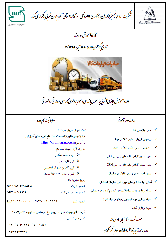 دوره آموزش مجازی آشنایی با اصول و مقررات بازرسی و ارزیابی کالاهای صادراتی و وارداتی توسط امینه جمی · منتشر شده مهر 22, 1402 · بروزرسانی شده مهر 23, 1404