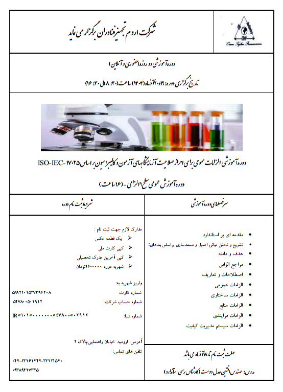دوره آموزشی الزامات عمومی برای احراز صلاحیت آزمایشگاههای آزمون و کالیبراسیون بر اساس ISO-IEC-17025 دوره آموزش عمومی سطح 1 الزامی – (16ساعت) توسط امینه جمی · منتشر شده آذر 16, 1404 · بروزرسانی شده آذر 16, 1404