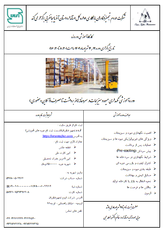 دوره آموزشی نگهداری میوه و سبزیجات در سردخانه ها از برداشت تا مصرف(آنلاین و حضوری) توسط jami404 · منتشر شده ژانویه 6, 2024 · بروزرسانی شده اکتبر 15, 2025