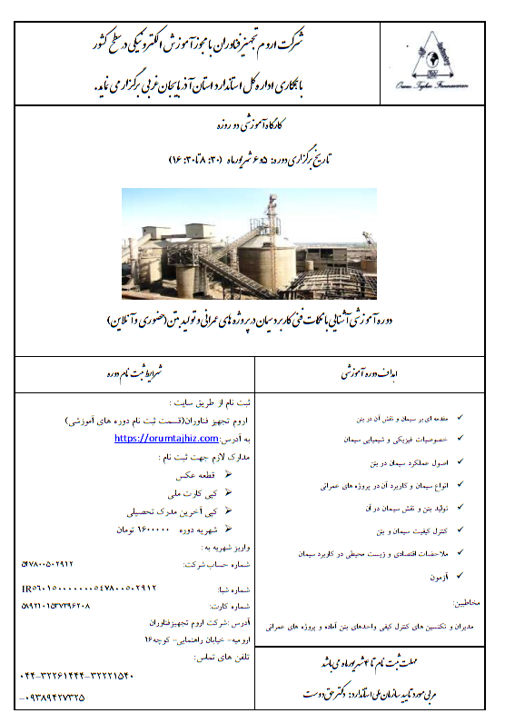 دوره آموزشی آشنایی با نکات فنی کاربرد سیمان در پروژه های عمرانی و تولید بتن(حضوری و آنلاین) توسط jami404 · اکتبر 15, 2025