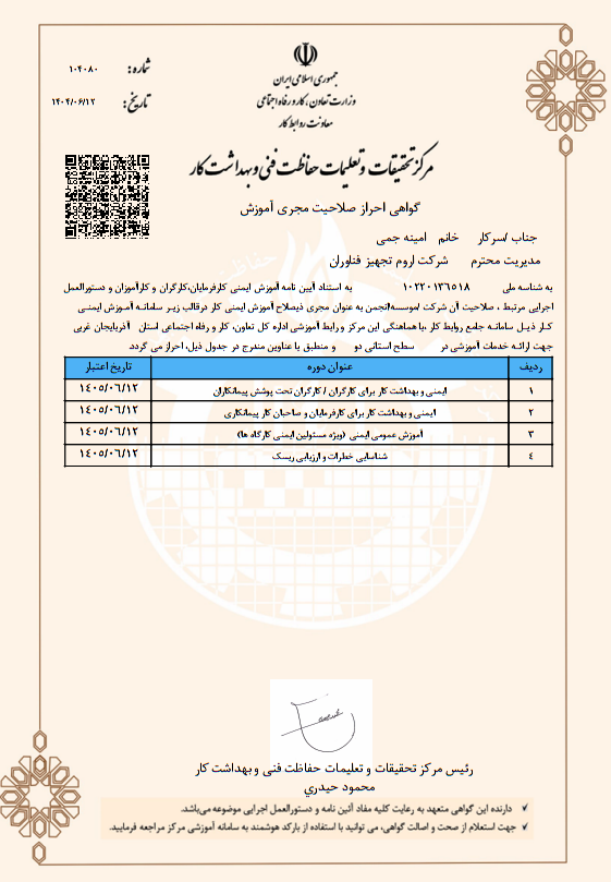 | 3 | آموزش عمومی ایمنی (ویژه مسئولین ایمنی کارگاه ها) | 60 | 2400 |